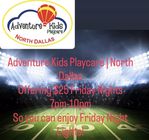 Join us for a Fun Filled Night Games, Crafts, Friends and Activities. Drop your children is a Safe, Licensed Childcare Center while you go enjoy the Friday Night Lights!