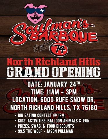 Soulman’s Bar-B-Que, North Texas’ favorite family-owned barbecue institution since 1974, is celebrating the official Grand Opening of its newest location in North Richland Hills with a community-wide event on Friday, January 24 from 11:00 a.m. – 3:00 p.m. at 6000 Rufe Snow Drive, North Richland Hills, TX 76180.